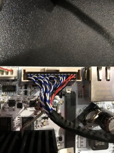 Take the other end of the cable and connect it to the LVDS -> HDMI converter board you purchased from AliExpress. Connect this to the connector further from edge of the board, with the red cables connecting starting with pin 1, indicated by an arrow on the board.