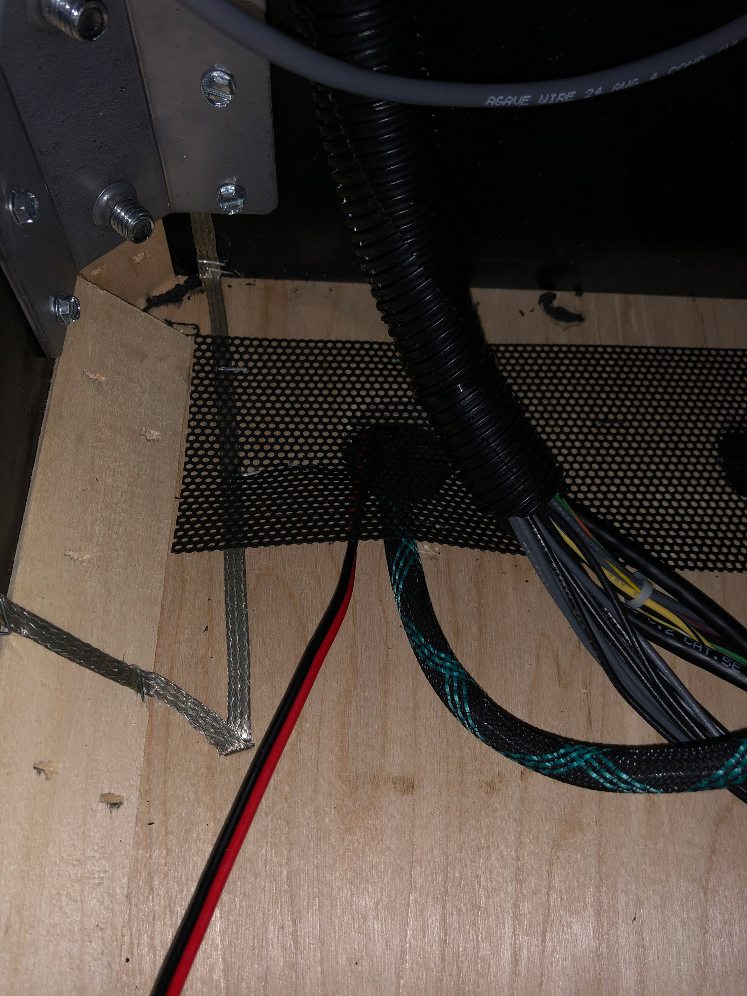 Under the playfield, at the back of the cabinet, you’ll see a row of air holes with a wire mesh covering them. Remove a few staples so you have enough room to feed the cable underneath the mesh and out the bottom of the cabinet.