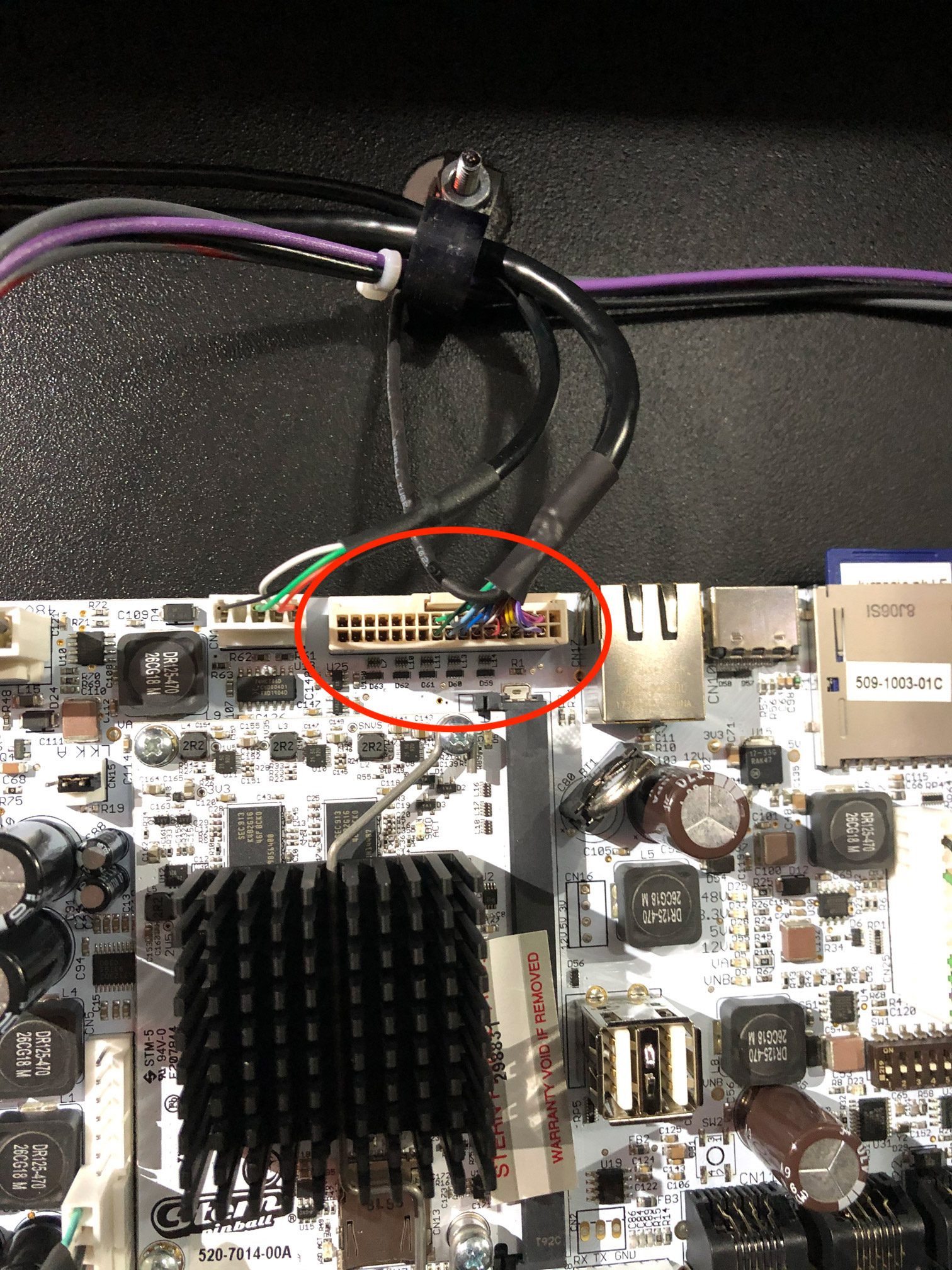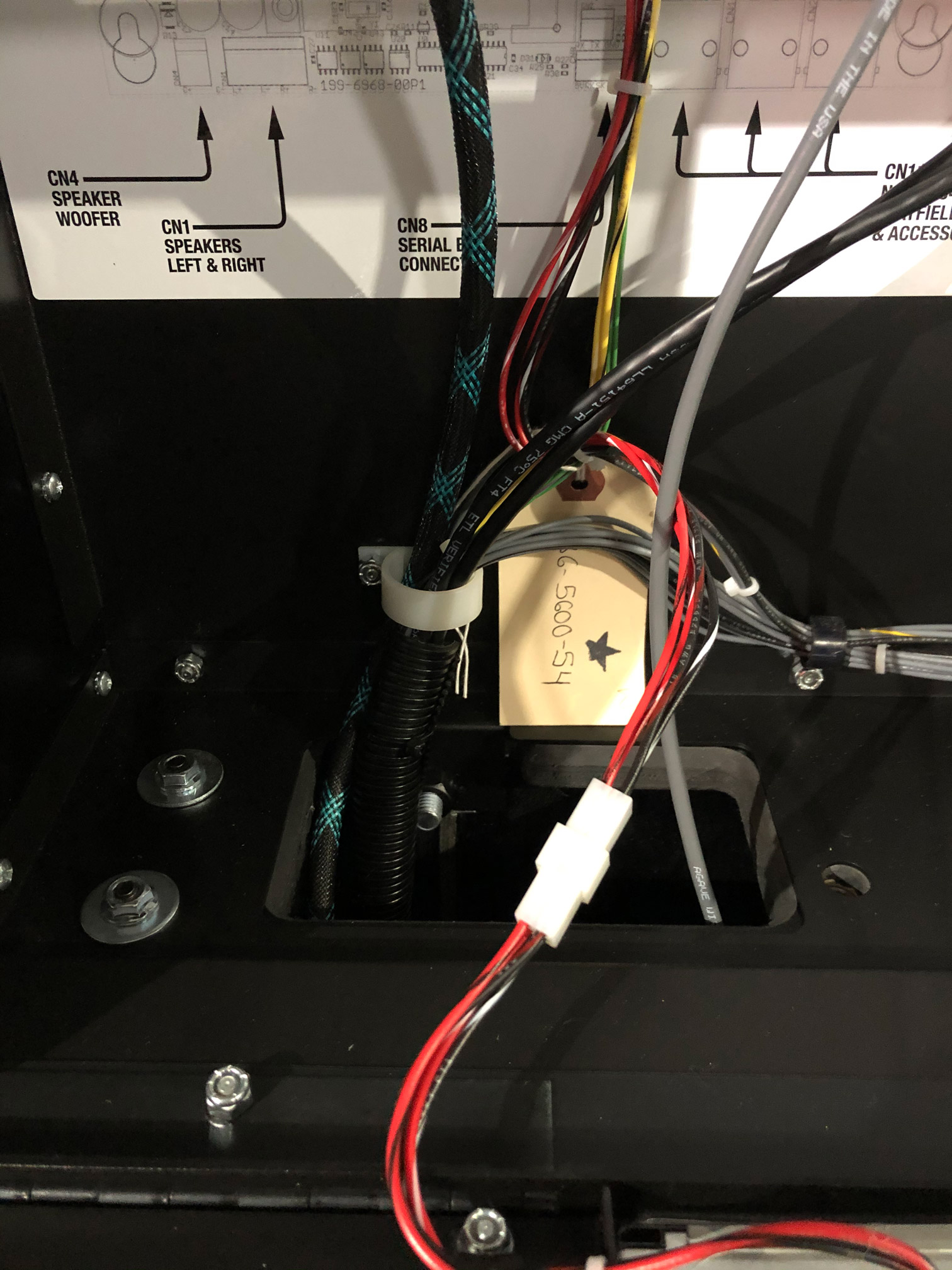 Open up the backbox of your game (keys are hanging by the coin slot inside the coin door), then take the translite off and fold down the display/speaker panel. The connector you’re looking for is at the top of the small white board. It’s the cable that connects to the larger of the two connectors on the back of the display.